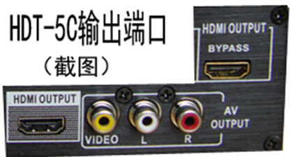 HDT-5C机器的右侧下部有一路 HDMI OUTPUT输出接口,右上侧有一路 HDMI OUTPUT BYPASS输出接口,下面有一路红白黄 AV输出接口。HDMI输出接口支持连接液晶电视机播放,而AV输出则可以连接模拟电视机播放。两路HDMI输出具有很重要的意义。其中的BYPASS输出接口,输出的视频信号没有经过压缩,具有不延迟输出播放的功能,可以与上层视频会议现场完全同步,可以连接面向会场的大屏液晶显示器或者投影仪使用。另一路HDMI接口,则具备经压缩有延迟和无延迟输出两种功能,通过遥控器进行随意切换。当进行系统设置或者回放视频时,特别是进行暂停录像操作时,必须利用这个经压缩输出操作。在经压缩状态,从上层会议传输过来的信号要延迟0.7秒左右。在该路输出状态操作完系统设置后,可以通过遥控器一键切换为无压缩无延迟输出状态,看到的视频则与上层视频会议现场是完全同步。