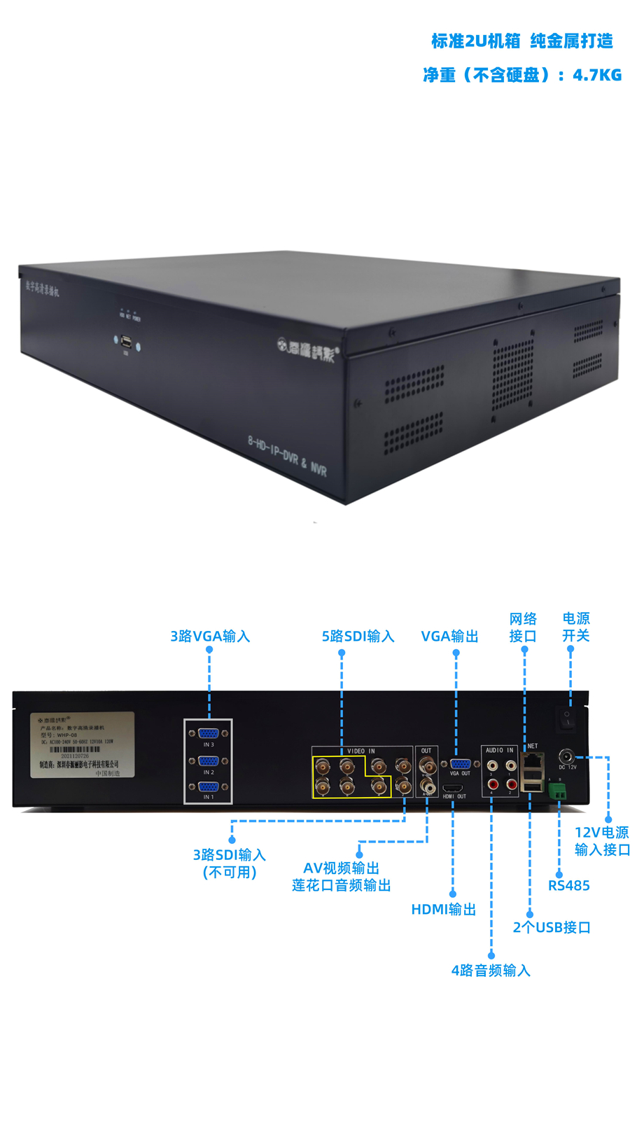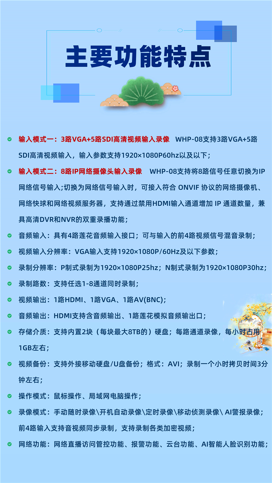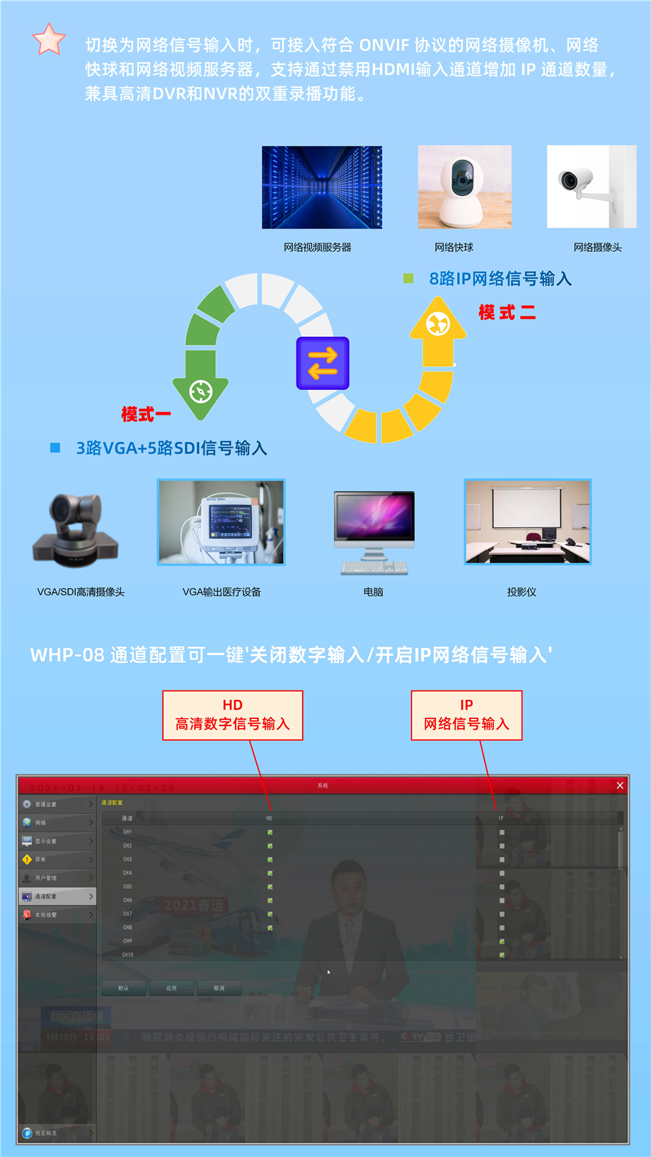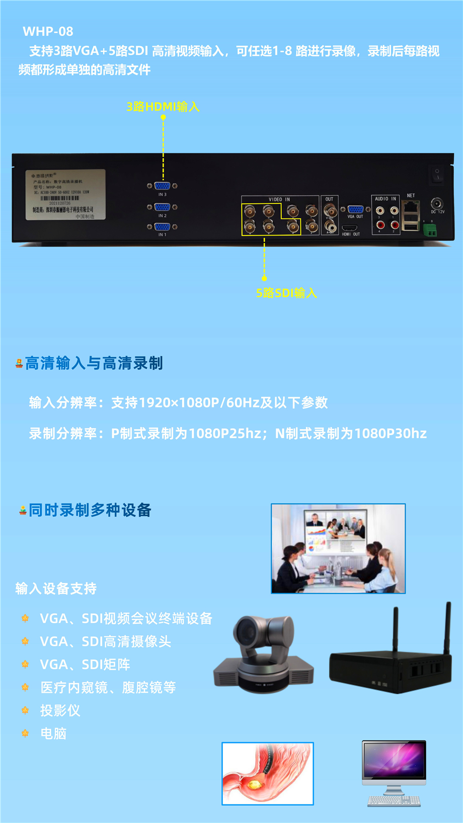 3路VGA5路SDI输入网络摄像机输入录播机WHP-08