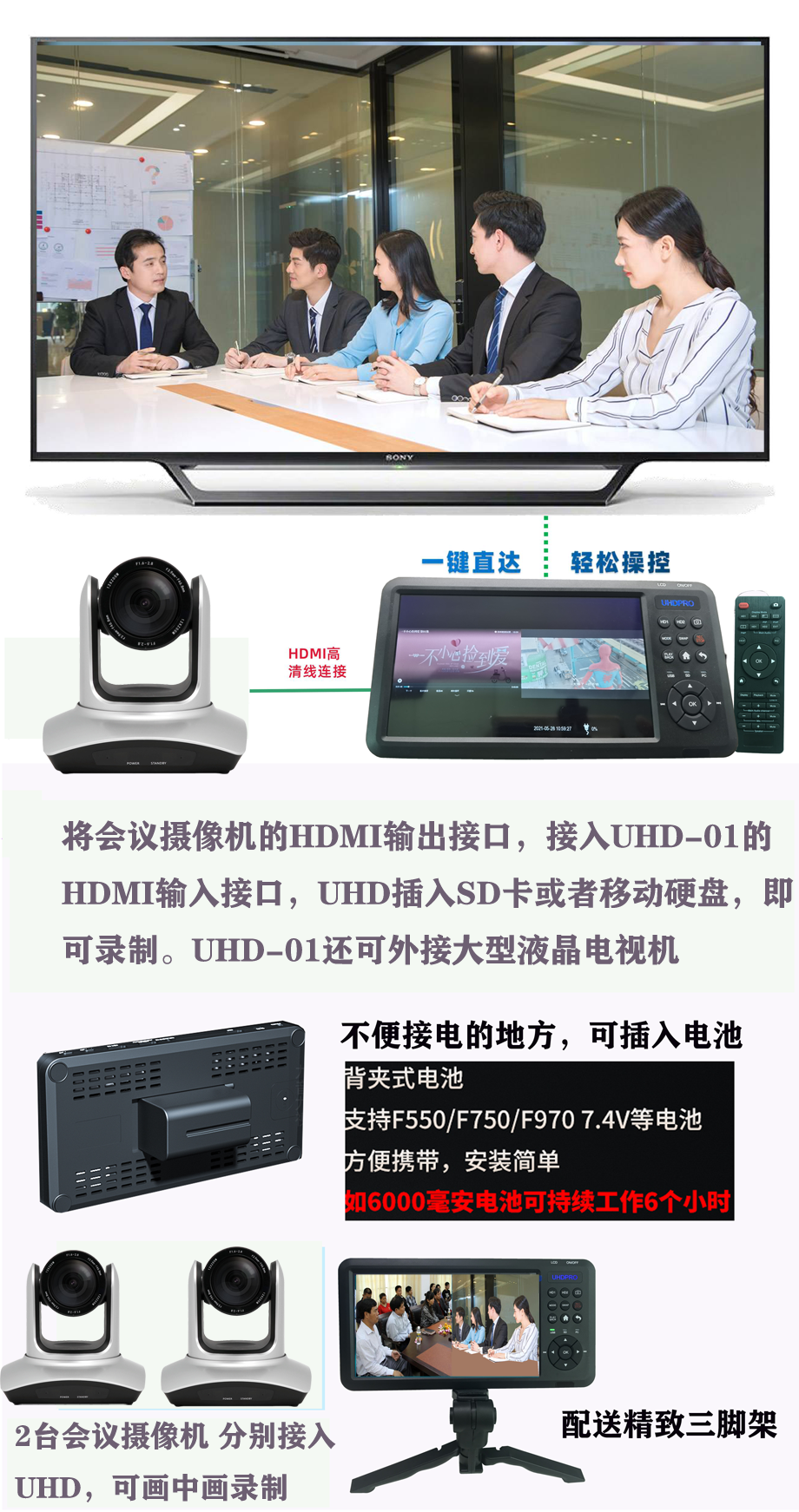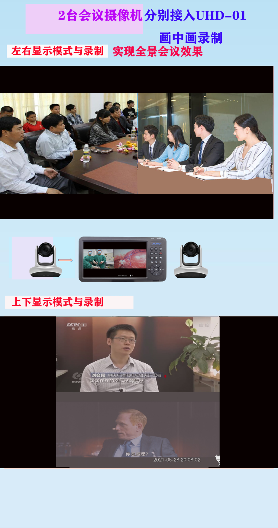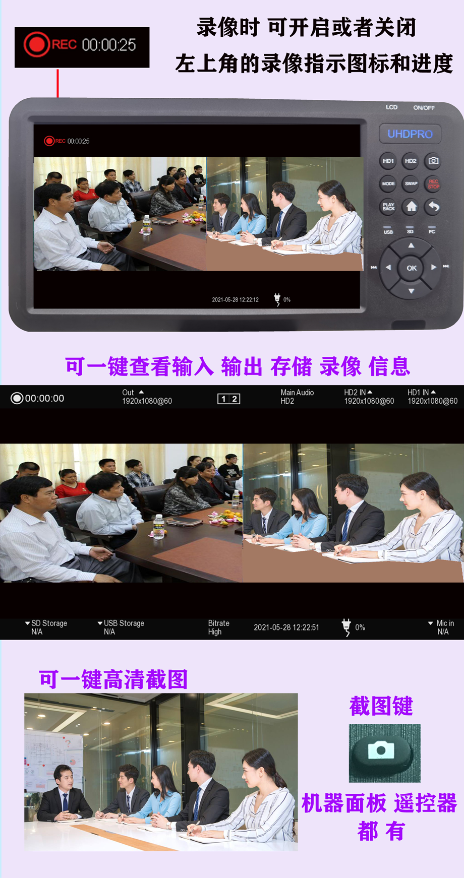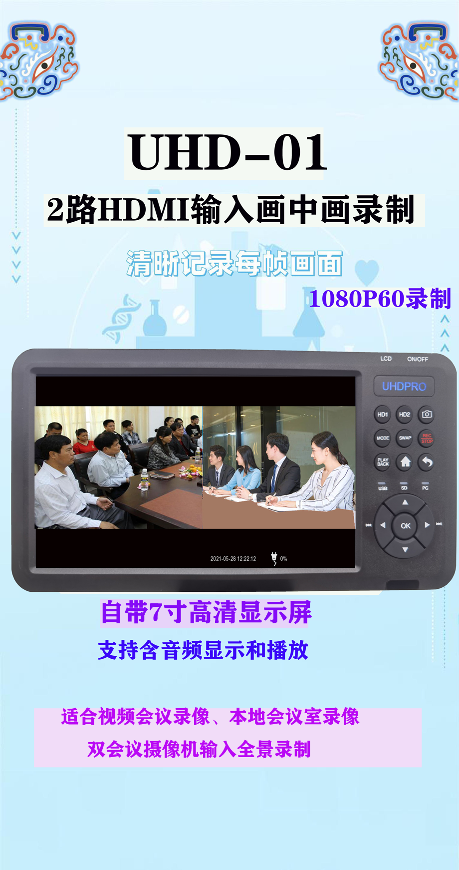 UHD会议版录像机,可接入1--2路HDMI会议摄像机,支持2路信号画中画录制,可秒切显示模式。自带7寸高清显示屏,支持插入可充电电池。可一键录制、播放、截图、删除!支持SD卡、移动硬盘录播。具有丰富的混音功能。是录制视频会议、小会议室录像的简约型产品。