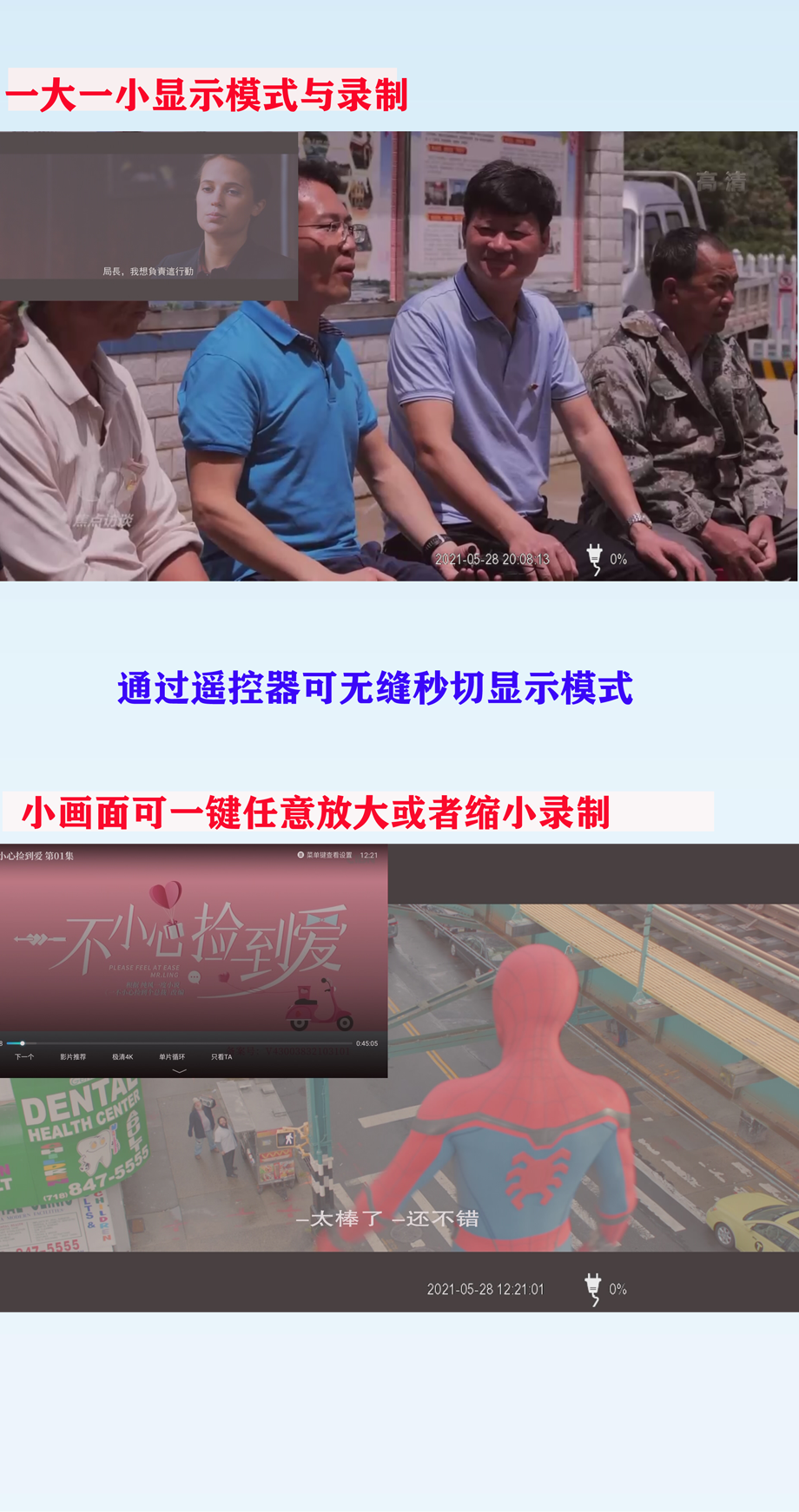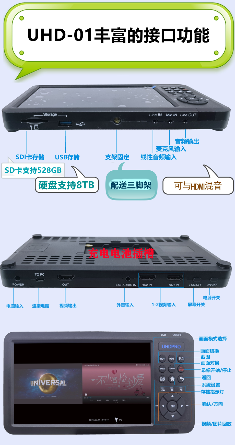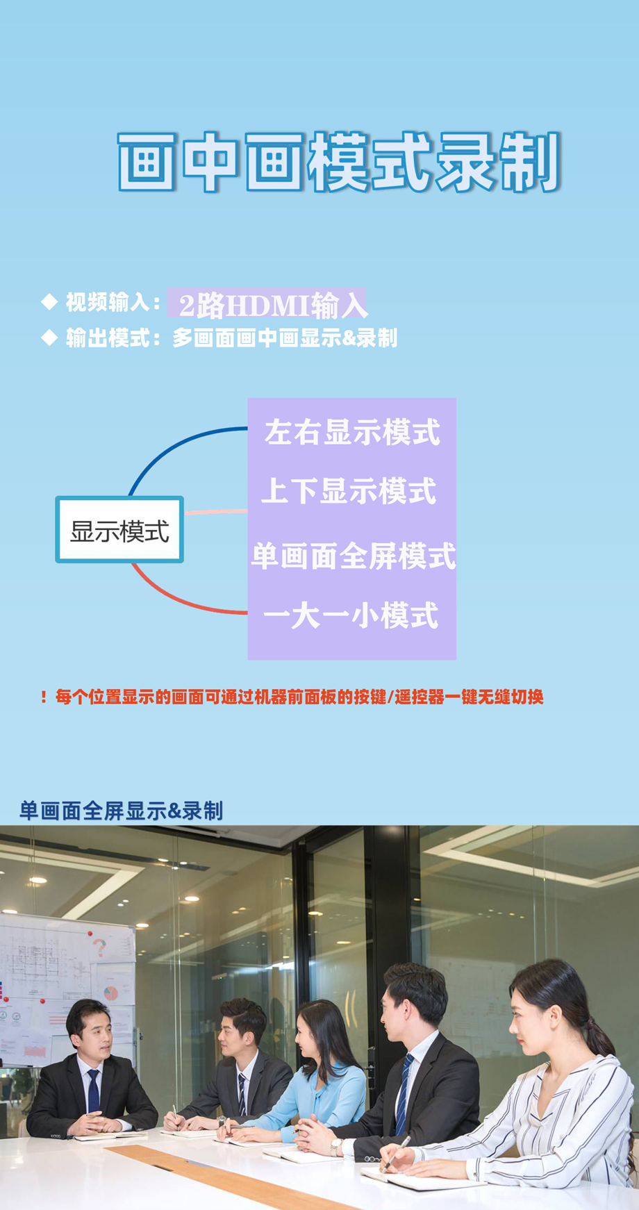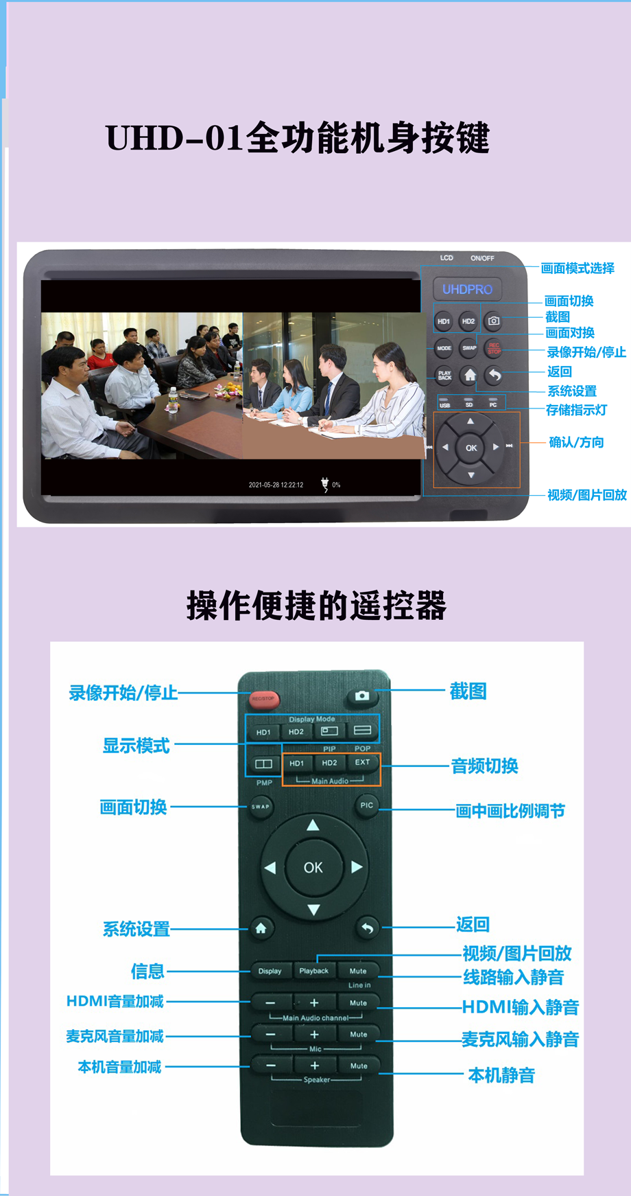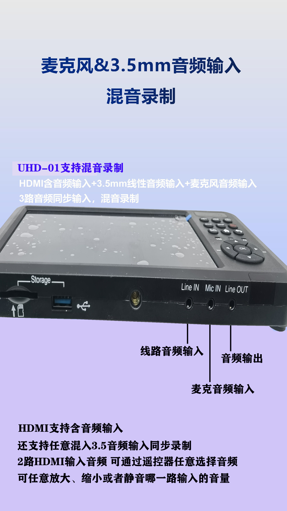 UHD会议版录像机,可接入1--2路HDMI会议摄像机,支持2路信号画中画录制,可秒切显示模式。自带7寸高清显示屏,支持插入可充电电池。可一键录制、播放、截图、删除!支持SD卡、移动硬盘录播。具有丰富的混音功能。是录制视频会议、小会议室录像的简约型产品。