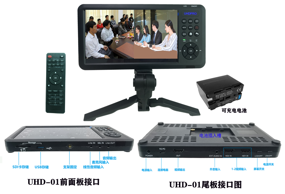 UHD-01机型,支持2路HDM I 4K含音频高清输入,同时还支持3路3.5音频输入与HDMI音视频信号混音同步录制。该机自带7寸高清显示屏,支持含音频播放。同时,该机还有HDMI输出接口,支持外接大型液晶电视机播放。也具有一路3.5音频输出接口。该机支持面板按键和遥控器控制操作。支持插入528GB的SD卡录制,支持USB接入高达8TB的移动硬盘录播。