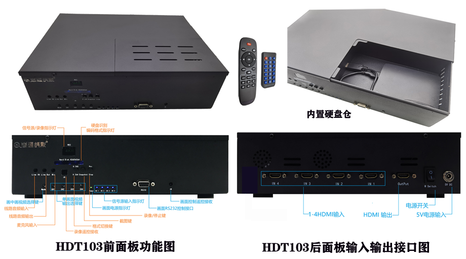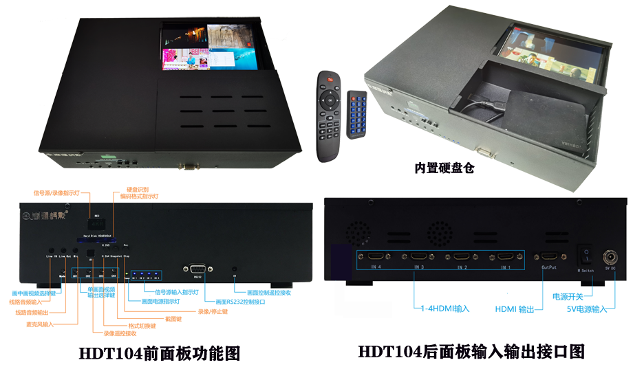 HDT103,支持4路HDMI含音频输入,具有HDMI输出接口。支持输入3.5的麦克和线路音频与HDMI音视频同步混音录制。支持机身面板按键和遥控器操作。具有内置硬盘仓,可以置放2.5寸移动硬盘或U盘,对硬盘保护更有保障,机型大方端庄,散热性好,稳定性强,作为企业使用,更显档次。 ![]()