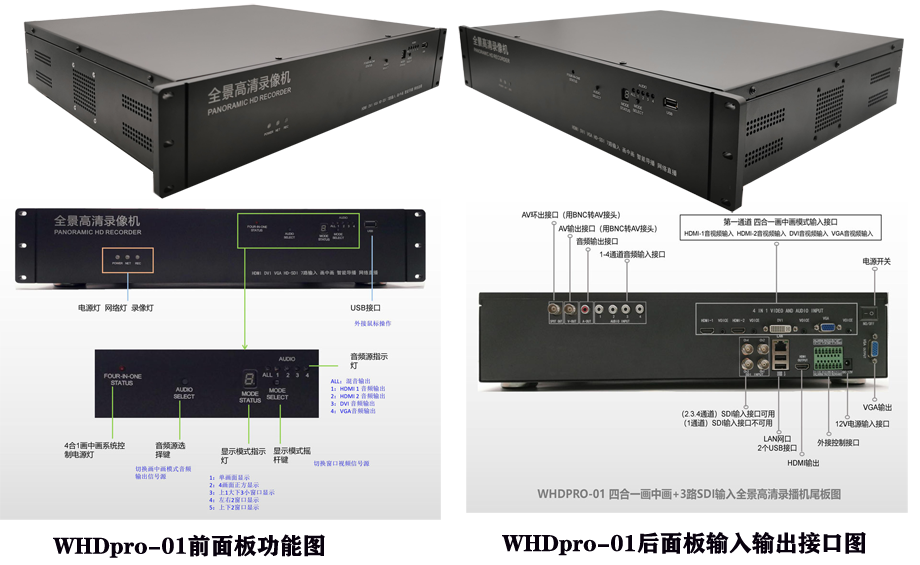 WHDpro-01机型,是目前使用尤为受欢迎的一款机型,因为该机支持输入接口多,支持全景录制,还有网络功能,还可以内置2块大硬盘。尤其是该机机箱是标准2U机箱,适合置放在机柜使用,深受企业欢迎。