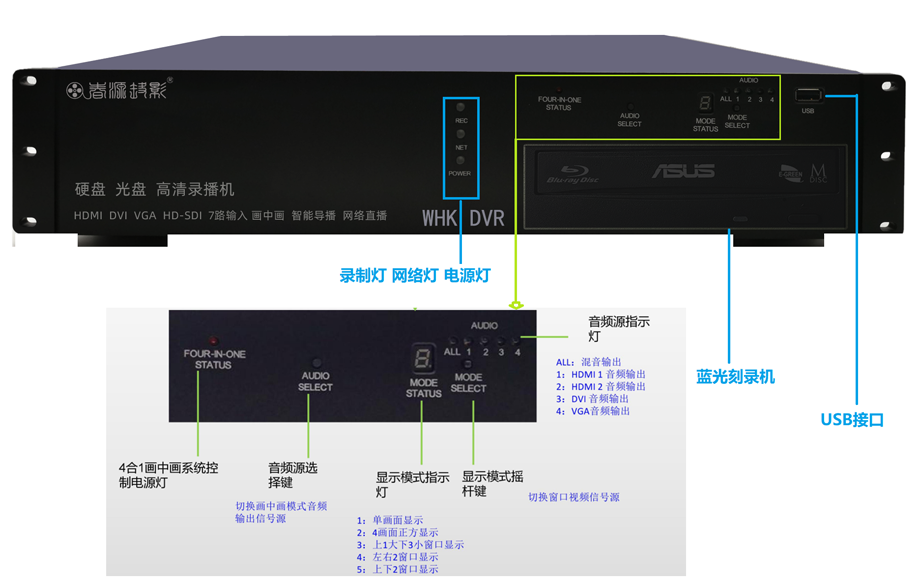 WHK-01机型,是在WHDpro-01基础上,嵌入了蓝光光盘刻录机。其他输入、输出接口以及功能性能、操控模式,均与WHDpro-01一样。但是,由于该机置入了蓝光光盘刻录机,使该机不仅支持硬盘录像,还可以同步录制到DVD光盘上,而且视频备份的时候,也可刻录到DVD光盘,对有些必需将会议资料刻录为光盘的用户,尤为具有使用价值。
