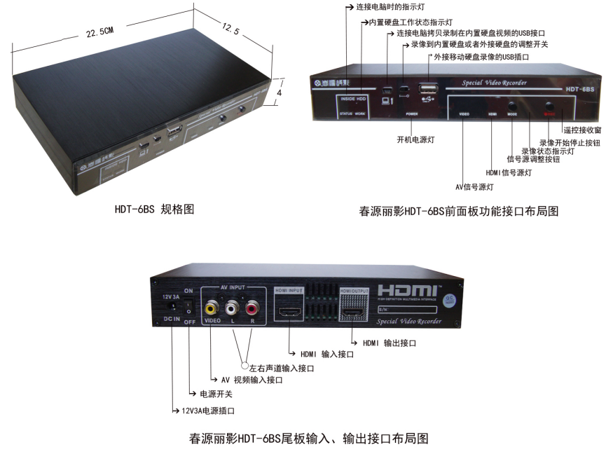 使用HDT-6BS,可以录制数字电视机顶盒、录制蓝光高清播放机、录制具有HDMI输出的电脑、DV机;还可以翻录具有AV输出的老式录像带!该机在HDMI不含音频时,可以输入红白模拟音频线配音录制,因此,也可用于小型会议室录像!