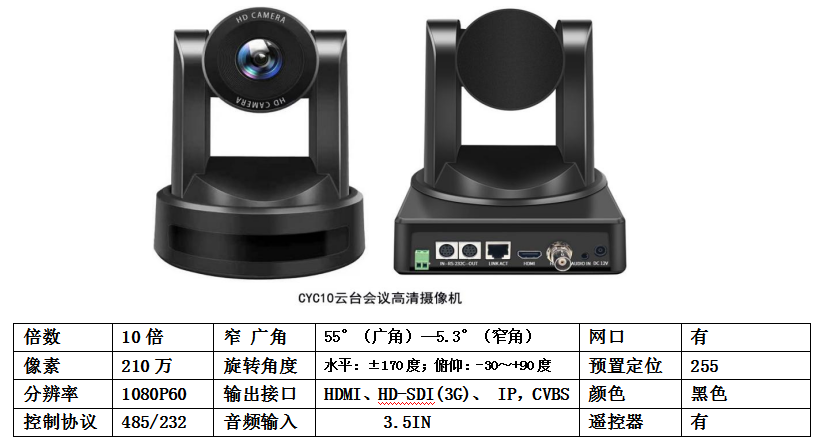 会议高清摄像机,是进行会议室录像的首要设备!进行高清录像,则必须使用具有HDMI输出接口的,能采集至少是1080P60hz高清视频的摄像机。为了灵活便捷的调整拍摄角度、聚焦、特写或者扫描拍摄,摄像机必须具有云台功能、自动、手动变焦功能、放大缩小功能、推远拉近功能、预置定位功能等等;同时,为了方便远程控制,摄像机还必须支持485或者232控制协议;支持联网操控。随着教学录像的普及,教室自动跟踪摄像机也越来越受到关注。为了帮助广大客户选择会议高清摄像机,本文将目前行业中具有代表性的几款产品型号推荐如下。