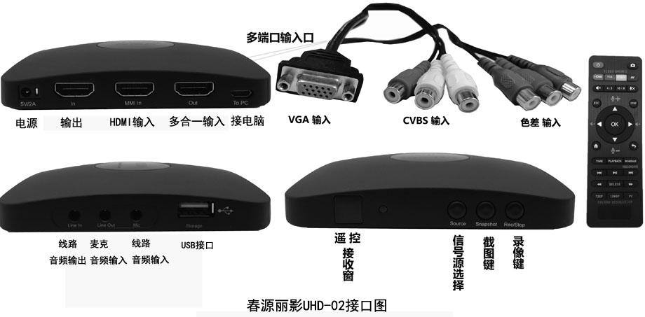 视频输入接口:1个HDMI、1组色差、1个VGA、1组AV(可任选一路输入录制)