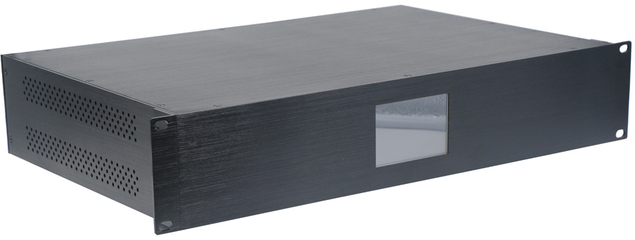 长:440mm、宽300mm、高100mm;主机净重:3KG;2U机架式全铝拉丝氧化机箱