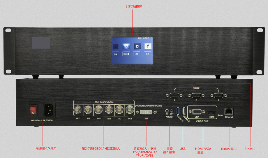 2、输入接口丰富,支持大型录播场合使用。7路物理端口+1路网络信号,可以满足不同摄像机、电脑、网络信号的输入录播;物理信号支持1080P60输入,录制达到1080P的高清效果。