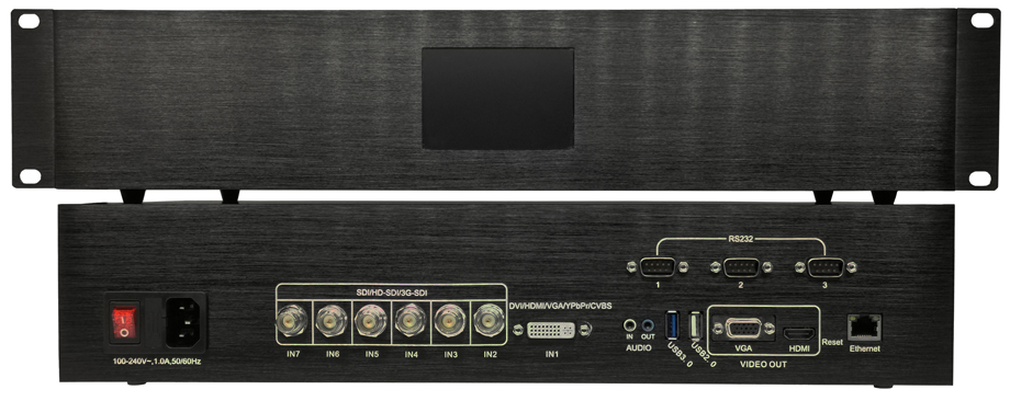 具有1个3.5音频输入接口,可以与7路输入的视频进行共享配音。HDMI支持含音频输出,同时具有1个3.5音频输出接口。