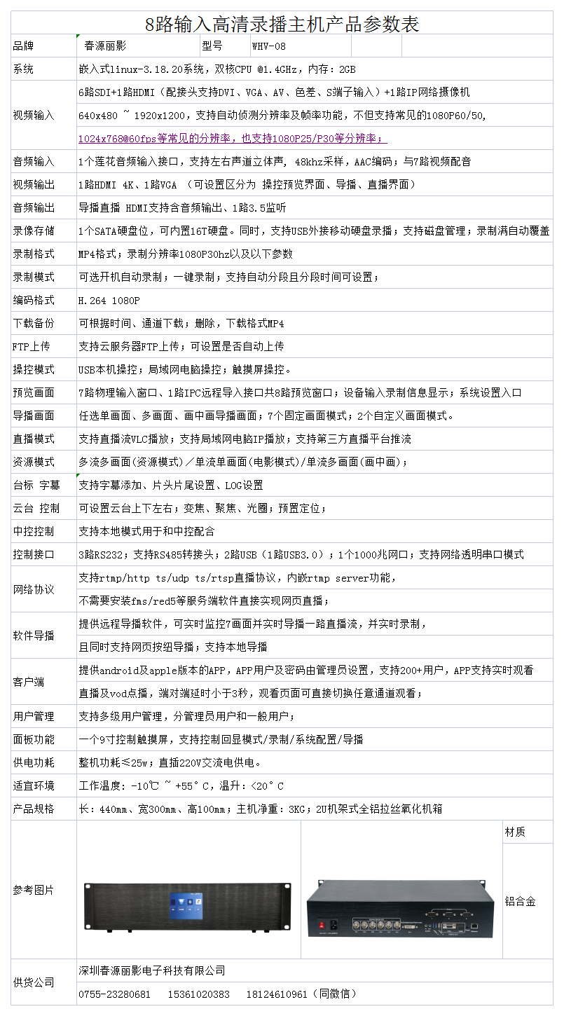 春源丽影WHV-08,支持8路输入高清录播,是目前行业内少有的能支持如此丰富数字接口的录播主机,可以同时输入1路网络信号,8路输入录播导播和直播,可以圆满满足大中型环境的录播使用。适合于广场大厅、大中型会场、大型体育场、多单分区隔断、法庭审讯、大中型教室、多单元展示同时直播导播等领域的录播、导播、直播、推流的使用。机器功能丰富、性能稳定、操作简洁、录播清晰度高、内外双硬盘同时录制更有保障、导播模式全面、直播可选性强、推流模式多、下载速度快,而且价格十分实惠,是一款实用性强,性价比高的多功能高清录播主机!