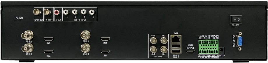 机器左下侧,有4个HDMI输入接口,支持1080P60hz输入,支持含音频输入。每个HDMI左侧有一个SDI环出接口,可实时环出这4路HDMI输入的信号。该4路HDMI输入录制后,为各自独立的音视频文件。
