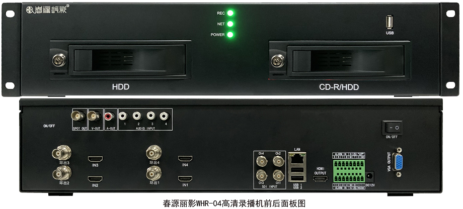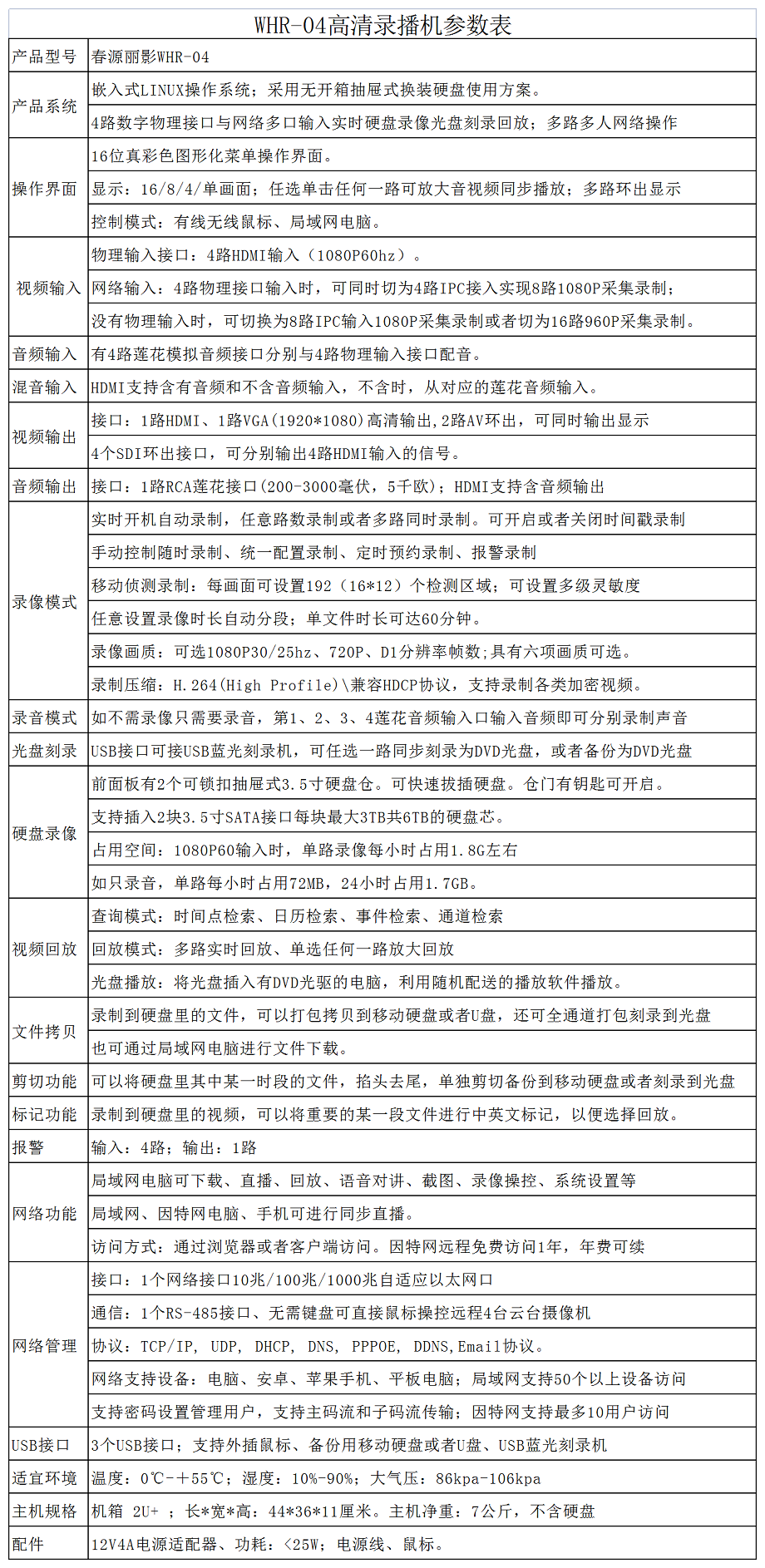 春源丽影WHR-04多功能高清硬盘录播机,支持4路HDMI输入接口,兼容各类高清摄像机、视频会议终端设备、各类广告机、电视播放机等接口输入录制;也支持多达16路网络IPC信号输入录制;置入了双带锁扣抽屉式硬盘仓,硬盘录像方便,USB光盘刻录便捷,不仅支持本机操控,也支持局域网电脑操控,还支持因特网远程直播。输入分辨率高,录制清晰度好,操控便捷,使用方便,而且产品售价与网络上那些价格昂贵的录播机相比,性价比高的多!该产品对于需要多路HDMI同时录制的用户,如多台视频会议设备同时录制、多间会议室同时录制、多台网络广告播放机同时录制以及大中型会议室录制、医疗手术示教录制、公检法问询录制、投招标室录制、教学讲课录制、舞台演艺录制、体育赛事录制、电视节目转播录制等领域,以及需要录制多台网络IPC信号的用户,具有极高的使用价值!