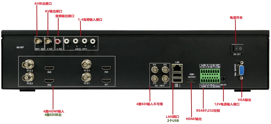 依次为2个AV BNC环出接口、1个红色莲花音频输出接口;四个白色音频输入接口,可分别为第一、二、三、四输入通道配音。4路HDMI含有音频输入时,也可进行混音。