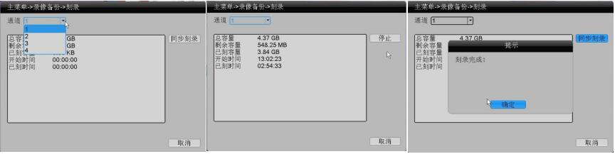 进入文件备份界面,选择任一输入通道,或者选择全通道,对已经录制到硬盘的文件,将需要刻录的文件打包为光盘容量兼容的大小,一键进行备份刻录,刻录完成,会提示刻录完毕,弹出光盘。