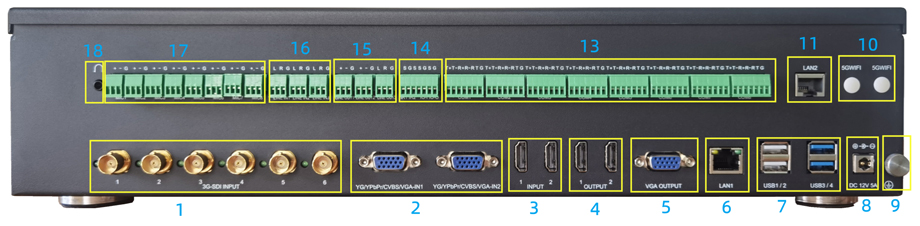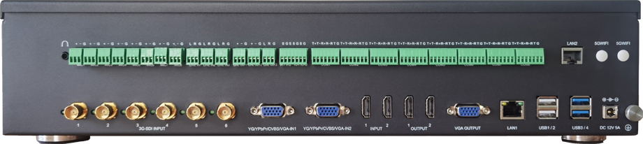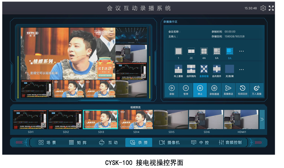 1、视频输入接口:6路3G-SDI+2路VGA+2路HDMI+3路可选IP网络摄像机或者视频终端设备;