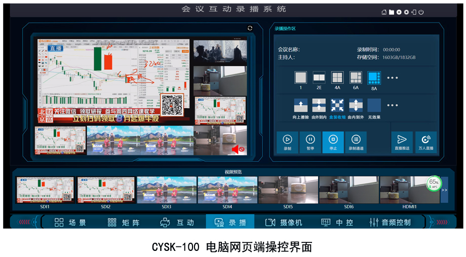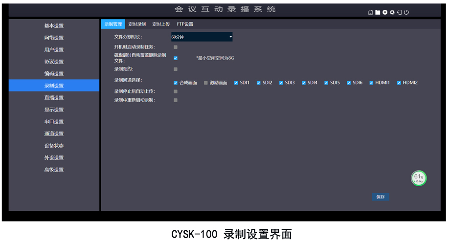 CYSK-100,是一款多路输入高端多功能光盘硬盘同步录播机。主要用于法庭审讯、智慧课堂、大中型会议、体育赛事、山林工地等重要场合的高清录播使用。产品具备多路录播、点播、直播、导播、推流、下载、拷贝、FTP上传、多设备中控等丰富的功能。