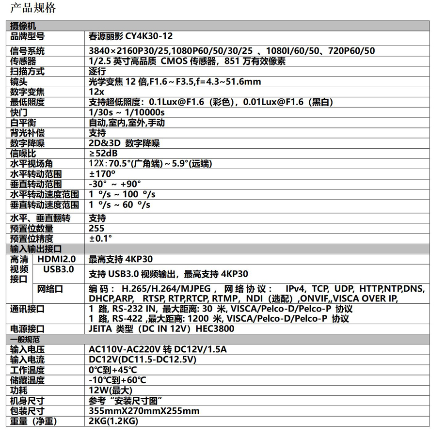 超高清、高性能4K 12倍 4KP30/25、自动跟踪、自带录像功能、 全接口