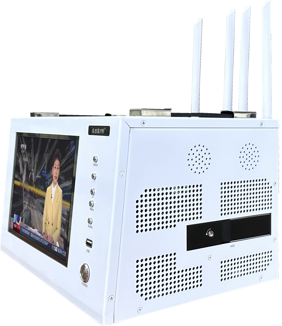 尾板顶部分别有2根无线视频接收天线;有2根全网通WIFI和4G网络天线;1个SM网络流量卡插槽;有网络状态信号源指示灯;有2个LAN网口;