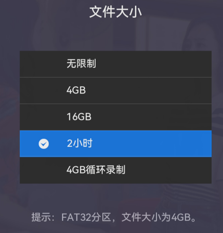 可选无限制持续录制;可选16GB、4GB自动分段录制;可选4GB循环录制、2小时自动分段录制。(如选择H265/HEVC编码、18Mbps码率4K30录制,每小时可录制10GB大小的文件)