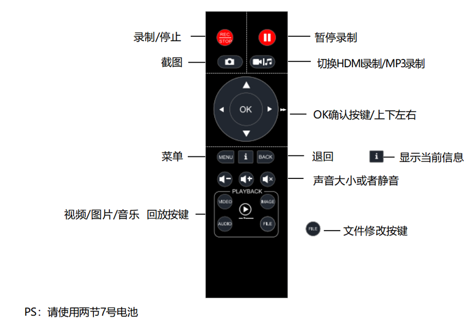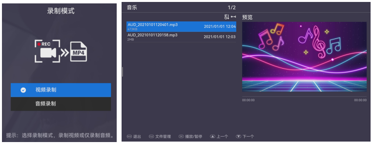 该机遥控器上有一个录像/录音选择按键。可以一键选择视频录制/音频录制。在有视频输入时,也可选择单独录音。没有视频输入,只有音频输入时,可以选择单独录音。录音格式MP3,方便播放和编辑。优美的音质效果,胜过各类录音笔、录音机,可用于会议录音、教学录音、电脑录音、监控录音等各领域使用。
