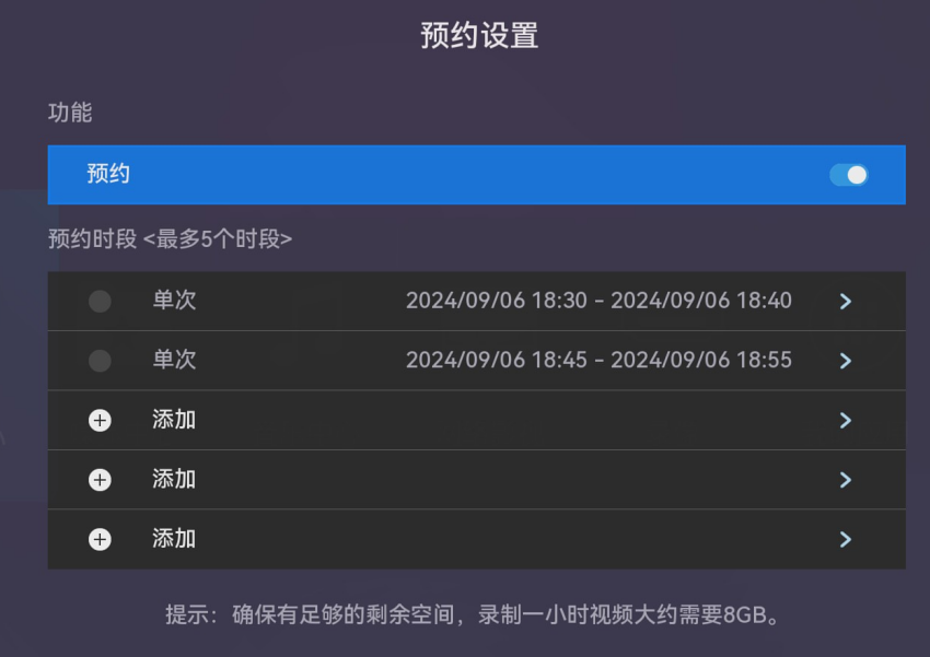 可以设定5个预约录制时段。到时自动开录,录完自动停止。