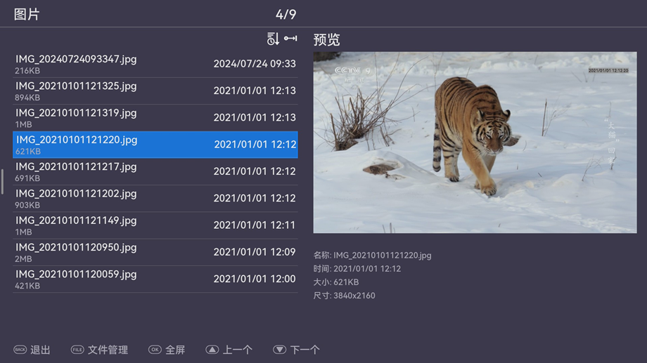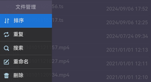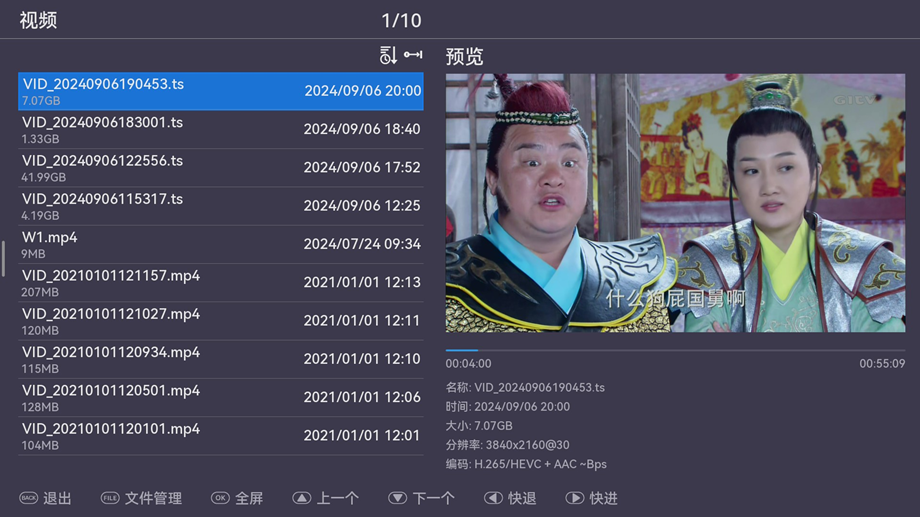 用遥控器进入主菜单,可以看到视频、音乐、图片入口,或者在遥控器上按VIDEO(视频)、AUDIO(音频)、IMAGE(照片)进入文件列表。在文件列表,可以小窗口预览,可以一键全屏播放。可以进行文件排序、重复循环播放、可以文件重命名、可以搜索文件、可以删除文件。