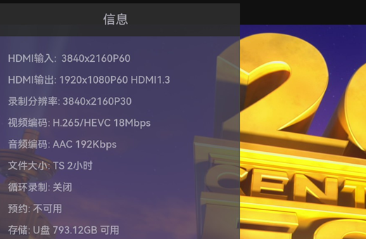 支持显示系统时间、录制图标以及预约录制前倒计时显示。