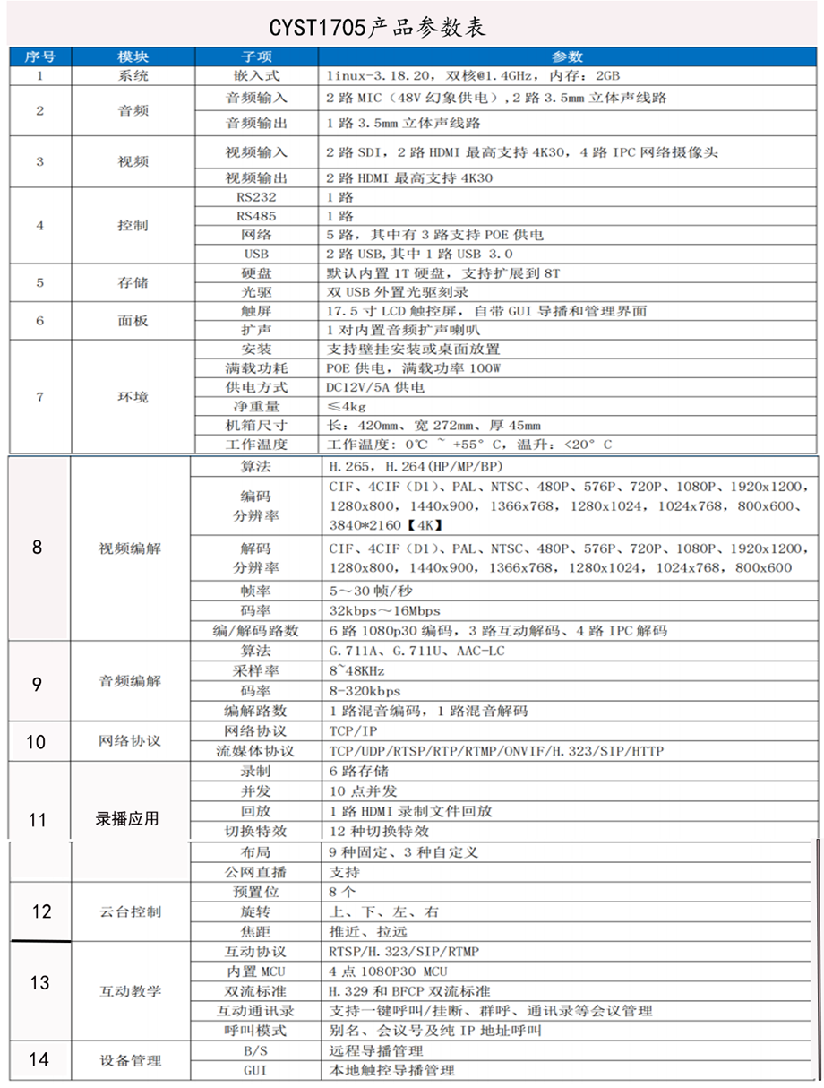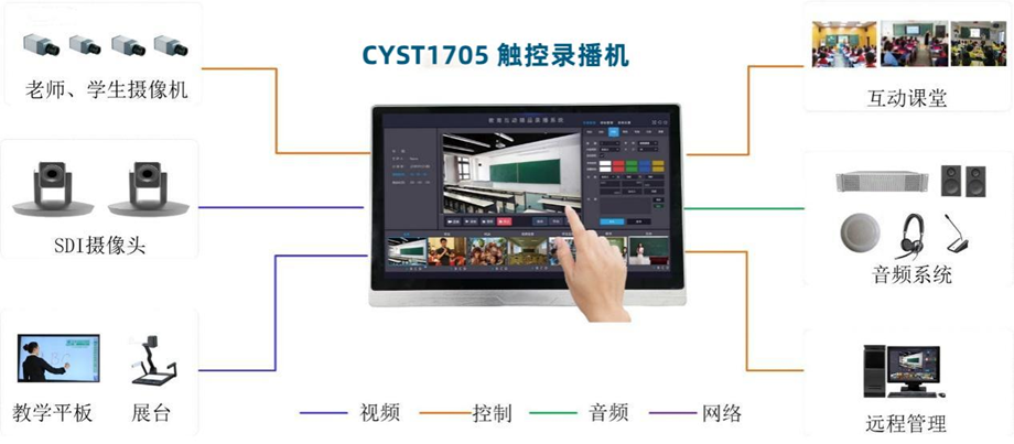 CYST1705触控录播主机采用纯嵌入式系统架构,具备4K画质,四方互动交互、多路资源同步预览和录制。集双导播触控管理、实时存储、直播、点播、回放、编辑、下载于一体化的行业专用触控录播主机。