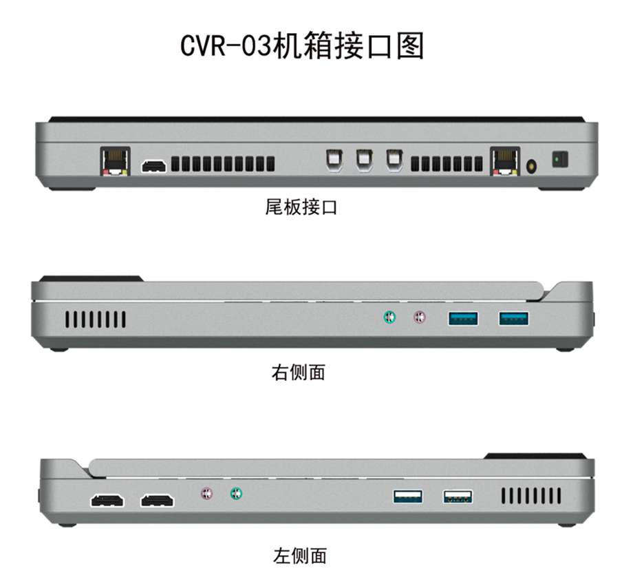 CVR103采用翻盖式设计,轻便铝合金材质生产,外观精致美观,典雅高端。配置14寸高清显示屏,嵌入全功能按键和多模式快捷按键和鼠标。机身前端嵌入双DVD刻录光驱,显示屏顶部前后各嵌入2个高清摄像头,内置4 阵列全向麦克风,自带扬声器。自带可充电电池,音视频输入、输出接口齐全。轻巧易携带,装配超简单,几分钟就可以搭建起会议/庭审刻录录播系统。