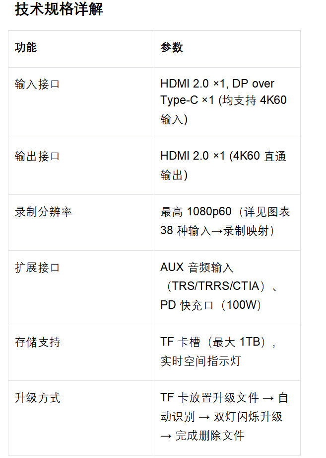 输入 4K60 信号时,自动优化录制 1080p60 高清视频,平衡画质与存储;独立 REC/STOP 物理按键,操作便捷高效。