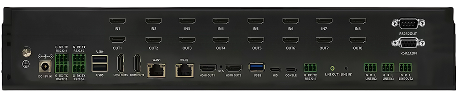 功能接口:视频输入8路HDMI,视频输出12路HDMI、1路IWC,音频输入1路3.5mm LINE IN、2路凤凰端子LINE IN、1路HDMI IN、1路UAC,音频输出2路3.5mm LINE OUT、1路凤凰端子LINE OUT、4路HDMI OUT、1路UAC,网络接口2路RJ45:10/100/1000M自适应,COM接口5路凤凰端子RS232,USB接口1路Type-A USB3.0、4路Type-A USB2.0、1路Type-B USB2.0、2路Type-C USB2.0,电源接口1路内径2.5mm,外径5mmDC电源插座。