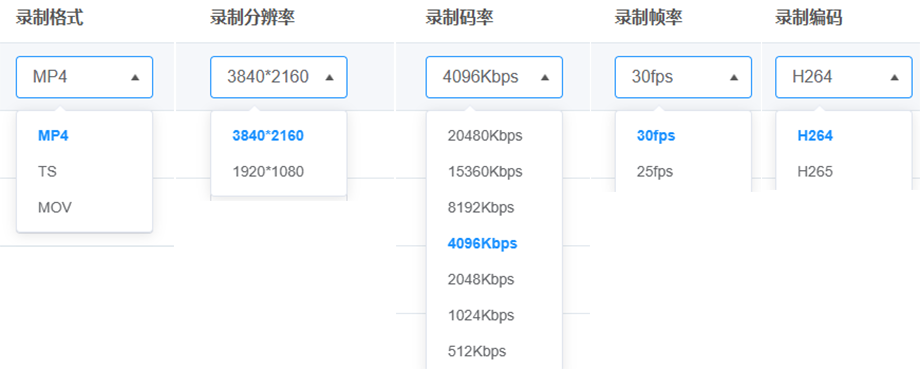 • 码率与画质:视频录制码率可在256kbps至20480Kbps之间灵活调节,可选H265/264编码,并提供CBR、VBR、AVBR、QVBR、CVBR、FIXQP、QPMAP等多种码率控制策略,以满足不同场景下对画质与文件大小的精确要求。录制帧率范围覆盖25至60fps可调。