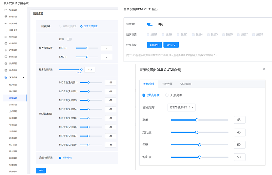 • 音频输入输出:音频输入接口丰富,包括1路3.5mm LINE IN、2路凤凰端子LINE IN、1路HDMI IN音频和1路UAC输入。音频输出则提供1路3.5mm、2路凤凰端子LINE OUT、4路HDMI OUT及1路UAC输出,支持混音录制。