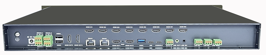 • 视频编码与输入:支持H.264/H.265两种高效视频编码标准。提供8路HDMI视频输入接口,兼容从640×480到3840×2160的广泛分辨率,最高支持4K@60Hz超高清信号接入,全面覆盖各类视频源设备。