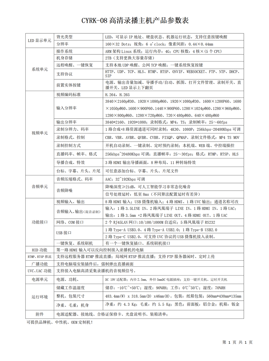 春源丽影CYRK-08是深圳春源丽影电子科技有限公司新近研发推出的一款集超高清音视频采集、录制、直播、导播、远程互动与智能管理于一体的专业级录播主机。机器支持8路HDMI+USB输入、4路HDMI+UVC、UAC输出,均支持4K30高清录制。具有HID反向控制以及广播功能。采用工业级ARM架构四核处理器与稳定的嵌入式Linux操作系统,专为满足教育录播、企业会议、培训直播、司法审讯、医疗示教等高端应用场景而设计,提供稳定、高效、功能全面的一体化解决方案。