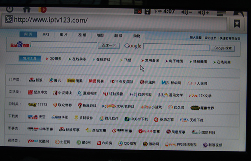 三、春源丽影588功能概述: 具备了安卓平板电脑的所有功能,同时兼有高清硬盘播放器所有功能,基本具备了常规电脑的功能。 1、登陆浏览器功能 可以任意输入网址,网页浏览、百度搜索、资料查询、文件下载、邮件收发、微博浏览和书写等。 ![]() ![]() 2、在线电影点播功能 支持下载安卓工具包所有视频网站客户端下载播放。如优酷、PPTV、土豆、奇艺、凤凰、PPS、迅雷、youtube、快手看片等数量庞大内容丰富的客户端。插入SD卡后下载客户端然后点击安装,打开就可以欣赏。画质清晰、播放流畅。 ![]() ![]() 支持后开发视频网站固件客户端安装使用。现在已经潜入了HDPfas聚合视频系统,丰富的视频网站可以尽情点击欣赏。同时,该客户端还将深入升级。 ![]() ![]() ![]() ![]() 支持大多数视频网站的浏览器输入网址或者百度搜索视频网址播放。由于主频超高,缓存丰富,支持FLS播放,因此,如优酷、奇艺、腾讯视频等,输入网址就可以播放。 ![]() ![]() ![]() 支持安装后开放的播放客户端,例如快播等一般播放器不支持,而经过本公司开发的客户端安装后,就可以流畅播放了。 3、同步电视直播功能。 系统潜入了高清电视播放固件、PPTV电视直播固件、网络电视直播固件、手机电视直播固件,300多套电视直播可以流畅清晰欣赏!点击就可以在线收看与有线数字机顶盒一样同步但是数量更多的卫星电视节目。随着后台的自动升级,可收看的频道数量将越来越多。端口简洁,频道排列整齐,用鼠标点击就可以收看,进入频道播放时间只需10秒左右。该固件属于春源丽影独家开发,并非安卓系统具备。播放可以全屏,清晰度达到了640P以上,高清的达到了高清数字机顶盒的效果。播放流畅,没有卡机缓冲现象。要求网速只要达到稳定的2兆就可以。 ![]() ![]() ![]() ![]() 同时,机器支持下载安卓工具包里面丰富的电视直播固件。手机电视固件客户端下载安装后,可以收看同步电视直播300多个频道。达龙影音、凤凰电视等都有很多电视直播频道。 ![]() ![]() ![]() ![]() |