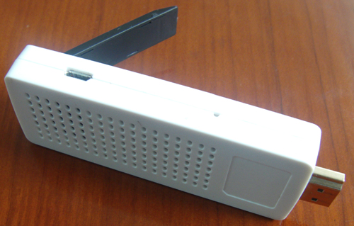 大拇指机身为乳白色,上下均匀点状散热孔,确保了机器的稳定使用。前面是HDMI插头,上面有一黑色可折叠峭立板式无线接收天线,左侧前面有一圆形遥控器远红外接收器插口,可以插入随机配送的遥控器接收器;左侧下面有2.0USB接口,支持插入无线鼠标接收卡、U盘、移动硬盘或者哈宝使用;右侧有迷你型USB接口,用于连接USB电源使用。