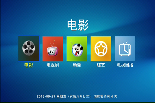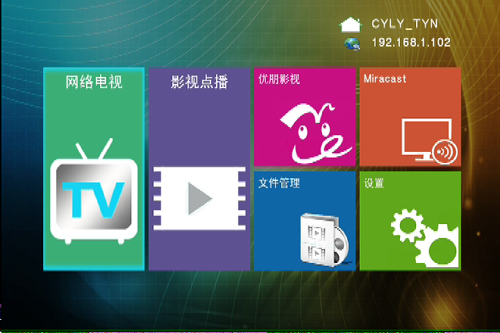 在清脆悦耳的开机启动音乐中,八大功能端口明晰的表现给客人。网络电视、影视点播、优朋影视、文件管理、智能互动、设置界面。