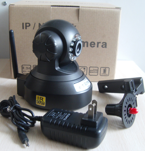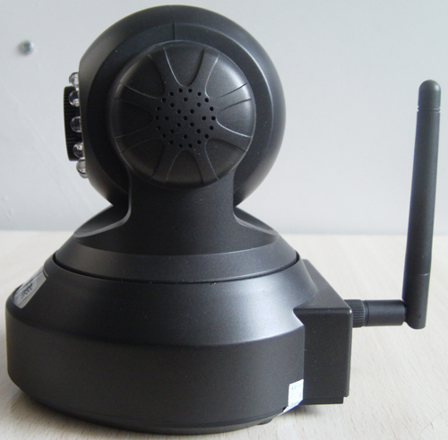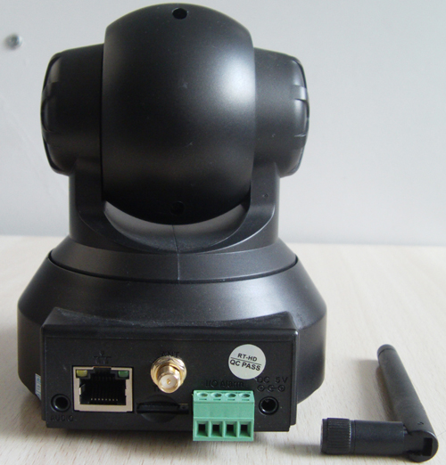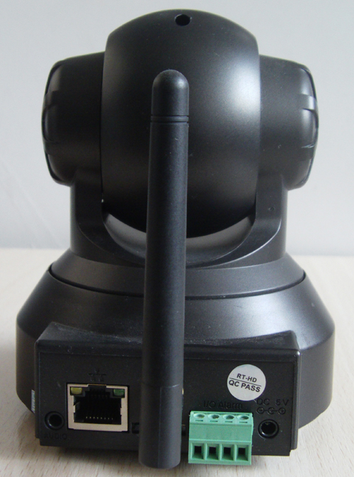 机器的猫头为整机的运转摄录装备,前面有灵敏度极高的传感器镜头,周围装配12颗红外扫描灯珠,底座为万向云台和内嵌处理器,机器内置超强WIFI,后面峭立可拆卸增益天线,左边有LAN网口,天线下面为TF卡插槽,右边为 和一键恢复插口。机器配有一个电源适配器和一个固定支架。