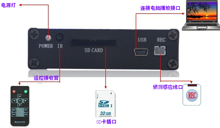 MNDVR-01机型小巧玲珑,制作精美。该机纯铝合金制作,长方形机身,纯黑拉丝外观,倍显质感。虽然整机比烟盒大不了多少,但是机身按键、输入、输出端子全面,操作使用非常方便。 机器前面端子接口图