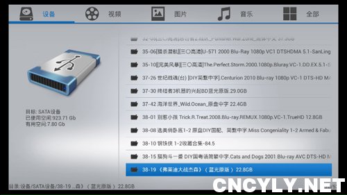 进入本地媒体后,可以便捷的找到外挂移动存储或者内置硬盘的文件。 分别显示为SATA设备和USB设备。顶部导航清晰的显示有设备、视频、图片、音乐、全部分类。一般蓝光视频文件比较多,该机总结了蓝光导航设备的优缺点,采用了直接显示播放文件的方式,因此,虽然没有蓝光导航功能,却更容易进行视频播放。机器具有记忆播放、选时播放、快进、快退、慢放、暂停、分段播放功能。由于采用SJB系统,支持在播放硬盘视频时,可以利用遥控器,进行便捷的字幕、声音、比例、3D调整、2D转换、色差、色彩、亮度等各类实用数据的调整。按遥控器的信息键,可即时显示有字幕、音轨、3D、全屏、循环调整入口。分别进入每个入口,又有更加丰富的设置模式,根据个人需要灵活设置。