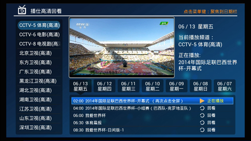 春源丽影每款网络播放机,均具有一周回放、一月回放功能。半小时之前、一周之内、一月之内,已经直播的内容,都可以随时回看!6月13日深夜2点15分进行的世界杯开幕式、以及巴西与克罗地亚的开场比赛隆重进行时,正是我国大多数球迷们酣畅熟睡时,不要担心错过欣赏时机了!天明醒来,等你有时间的时候,打开春源丽影播放机,进入电视回看端口,可以随意悠然自得的、如临其境的收看已经播放过的直播精彩!