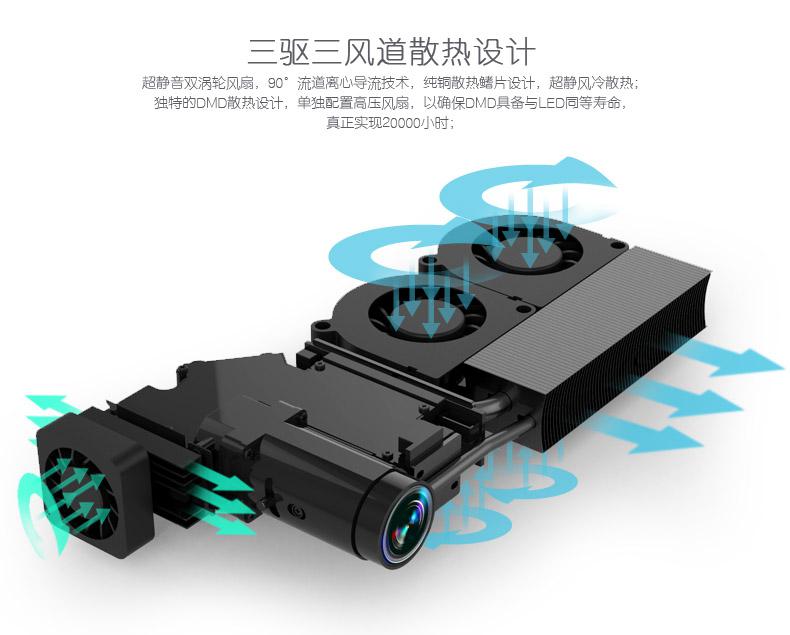 众所周知,智能投影仪最核心、昂贵的部品是光机,光机的好坏直接决定了投影仪的真实寿命和效果,而DMD芯片又是光机内最核心和昂贵的部件之一,如果烧坏,整个投影仪将无法工作,而且维修费用很高。DMD的工作温度如果超过65度就很容易被烧坏。而光机内另一核心部件是LED光源,LED的真实寿命在于光衰程度,温度则是影响光衰的直接因素,工作温度越高光衰就越严重,投影效果就会越来越暗。LED投影光源的工作温度一般在65度左右,如果超过,就会加快光衰的速度,很难保证智能投影仪工作20000小时中亮度不减弱。