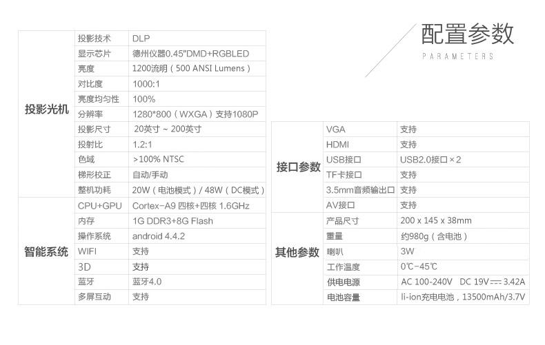 春源丽影WT-04产品,采用美国德州仪器0.45DMP+RGBLED芯片技术,采用升级版DLP投影方案,真正适用的1200流明度,100%的亮度均匀性,大于100%的色域,1000:1的对比度,1080P的高清分辨率显示,具备了稳定的高亮度投影效果。即使投放200寸以上的大屏幕,白天只需简单拉窗帘,夜晚可以与高清液晶电视机媲美。画面比例为16:10,并拥有1.2的投射比,能够在2米距离投射出80寸画面,2.5米投射出100寸画面(相当于4台50寸电视面积),而在5米距离时可以投射出200寸的超级巨幕,为家庭用户带来颠覆视觉体验的真正的影院级享受。播放办公文件,文字清晰,无重影,不跑焦。