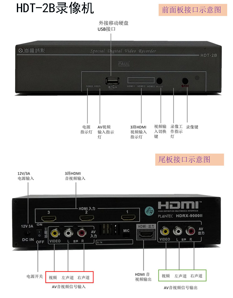 HDT-6BS机型,与HDT-6B不同的是,出厂就内置了一块1TB的硬盘,可以连续录像240多个小时;也可以从USB外接移动硬盘录像。HDT-2B机型,与HDT-6B一样,只能外接移动硬盘录像,但是,HDT-2B的综合功能更多,与HDT-6B、HDT-6BS相比,增加了暂停录像、混音录像、无延迟输出、开机自动录、编码录像功能,录像更加专业,功能更加全面。HDT-2B具备的暂停录像功能,是目前国内外录像机产品中少有具备此功能的产品。当遇到有广告等不想录制的视频时,可以一键暂停录像,然后再一键开始录像,录像前后是一个文件,大大方便了后续回放和视频编辑,实用价值极高。