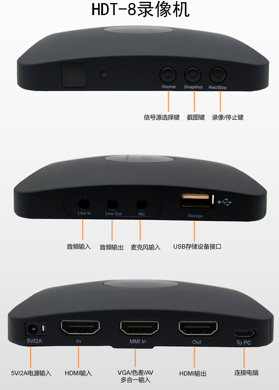 个别家庭和个人用户,有时会录制一些短小的机顶盒节目、电脑播放的画面,不想投资太多购买专业录像机产品,这里给大家推荐HDT-8机型。HDT-8是采集卡变通而成的一款简易录像机。该机录像格式为MP4,录像时或者设置为20分钟左右分一段或者设置为不分段一直录像进行人工停止录像,在录像时不能突然断电,否则正在录制的视频会丢失。该机在录像时不能回放,需要在录制完毕后进行回放。但是,该机的优点是输入接口全面,具有HDMI、VGA、CVBS、色差输入接口,不仅可以简单的录制数字电视机顶盒节目,还能录制VGA输出的台式电脑、老式播放器的CVBS或者具有色差输出接口的播放设备,特别是该机只有几百元的售价,具有一定的性价比。