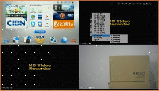 因为该机支持4路同时输入录像,开机默认四个通道窗口画面;每个通道有信号输入时就有输入的视频画面。没有信号输入的通道,该窗口为黑屏。每个通道的左下角有个关闭的小喇叭图标。如想让哪一个通道窗口有声音,则用鼠标点击一下打开该通道的小喇叭即可。每个通道的左下角默认有该通道的编号名称,可以在系统设置里修改名称或者关闭名称显示。开启录像的通道,在该通道窗口左下角会显示出一个长方形的录像图标;关闭录像后,则该录像图标也消失。在屏幕的右上角显示有开机和录像时间戳,可以在系统设置里开启或者关闭该时间戳。