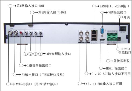WHD-02机型,共有4个视频输入接口,分别有2路HDMI、2路HD-SDI(BNC)输入接口,4路(莲花)与视频对应的音频输入接口;具有1路HDMI、1路VGA、2路AV(BNC)输出接口;具有1路莲花音频输出接口。前面板有一个USB口,后面板2个USB口;1个LAN网口;一组探测控制端子。