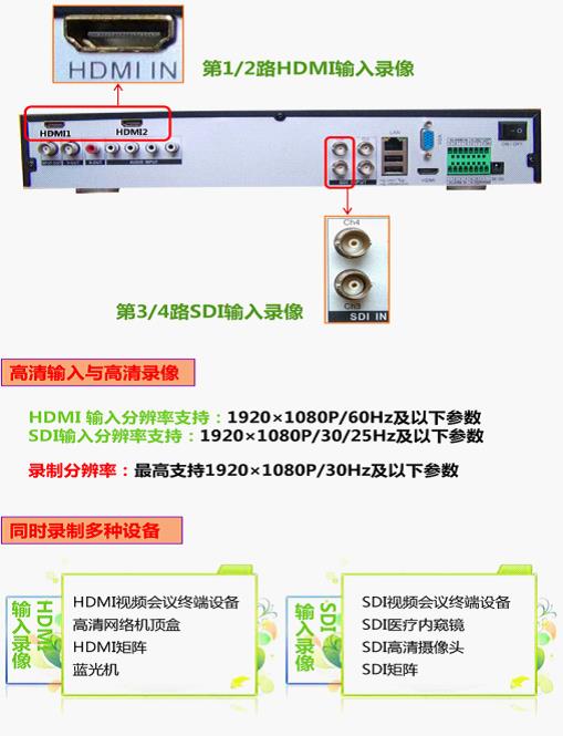 HDMI输入支持1080P60到480P;SDI输入支持1080P30\25hz。录像分辨率为1080P30\25到480P。输出分辨率支持1920*1080P60到以下各类参数。